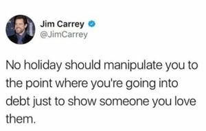 Engar hátíðir eiga að snúast um það að koma þér í skuldir til þess eins að sýna einhverjum öðrum að þér þykir vænt um viðkomandi. – Jim Carrey