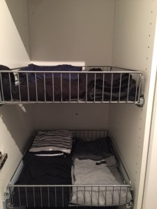 Ég tók í burtu öll fötin mín og setti í box. Eftir voru óléttufötin og þau föt sem ég get verið í á meðan ég er ólétt. Buxur, sokkabuxur, pils, bolir, hlýrabolur, náttbolir, kjólar, peysur, úlpa, húfa, vettlingar, trefill og skópör er það sem ég mun nota = 34 stykki.